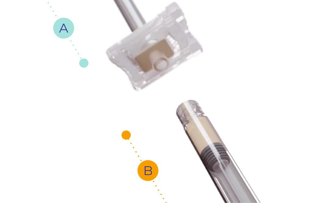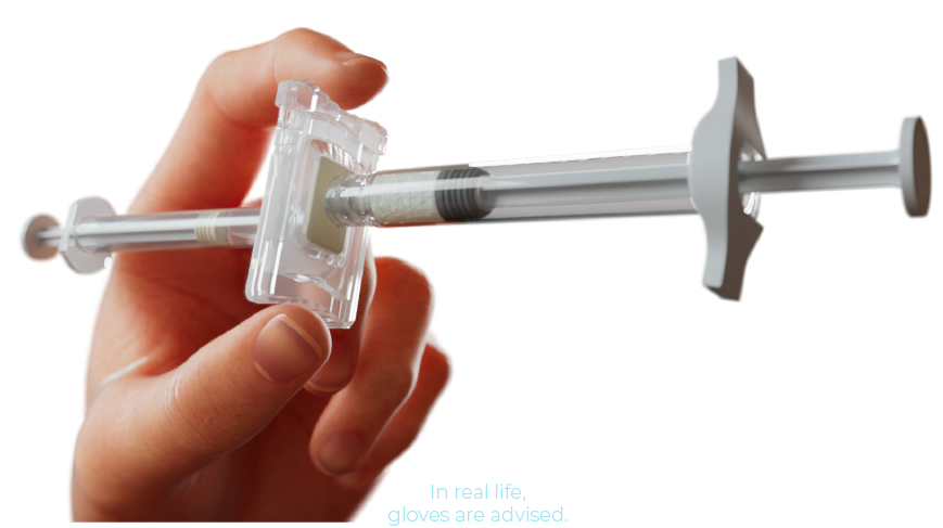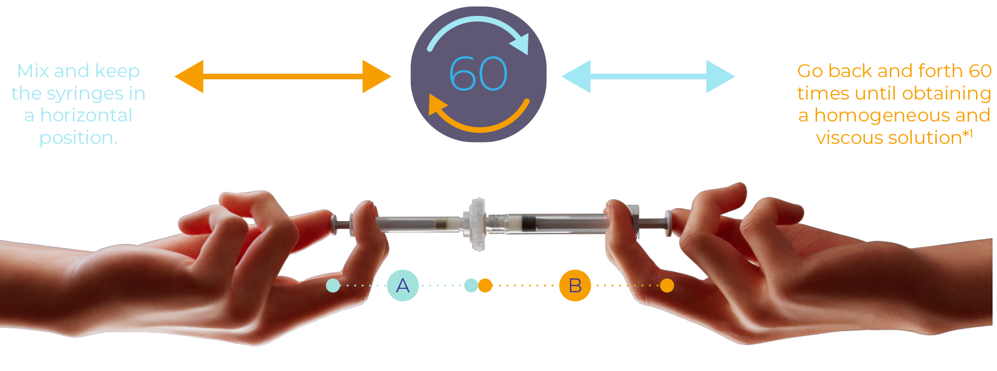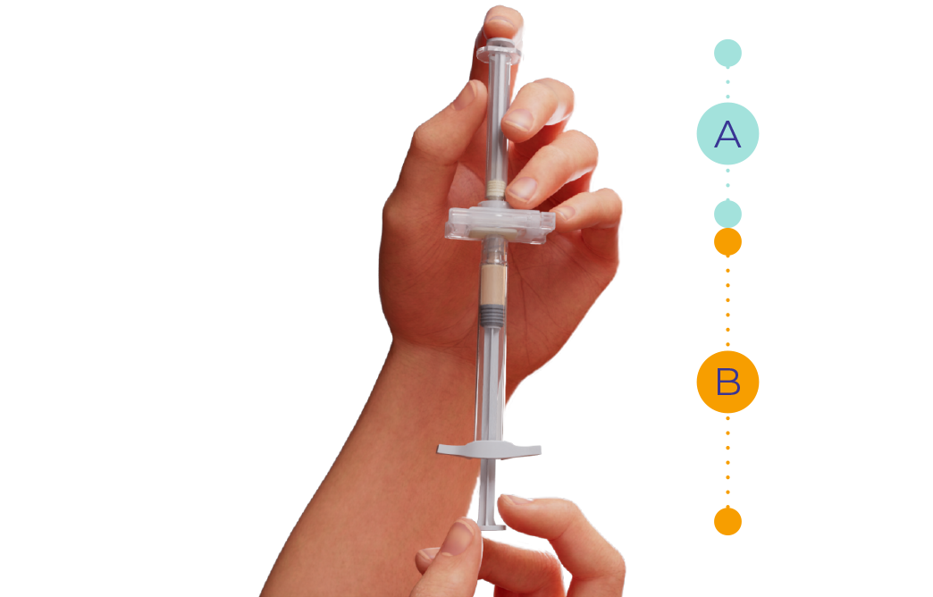Hold the syringes in a horizontal position and slowly and gently transfer the liquid from syringe A to the powder of syringe B.